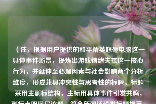 本文将围绕“和平精英怒砸电脑”这一现象,分析其背后的心理因素、游戏设计的影响、社会文化的影响,并提出相应的解决方案,以帮助玩家更好地管理情绪,避免因游戏而影响现实生活。