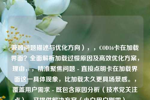 COD16加载关卡时间过长的问题,主要源于硬件性能、游戏文件完整性、 *** 状况和后台程序干扰,通过升级SSD、优化游戏设置、关闭后台程序等 *** ,玩家可以显著缩短加载时间,提升游戏体验,如果问题仍未解决,建议联系官方 *** 或等待后续补丁优化。